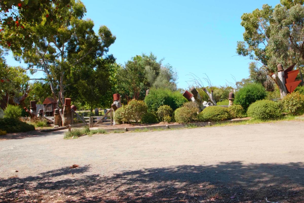 Trembath’s 25-metre-long installation of wood and metal comprises groups of recycled tree trunks fitted with metal caps. The rustic fence runs between the groups of tree trunks with native planting in clumps along it. The fence line incorporates a functional engineered double gate and post and rail fencing.